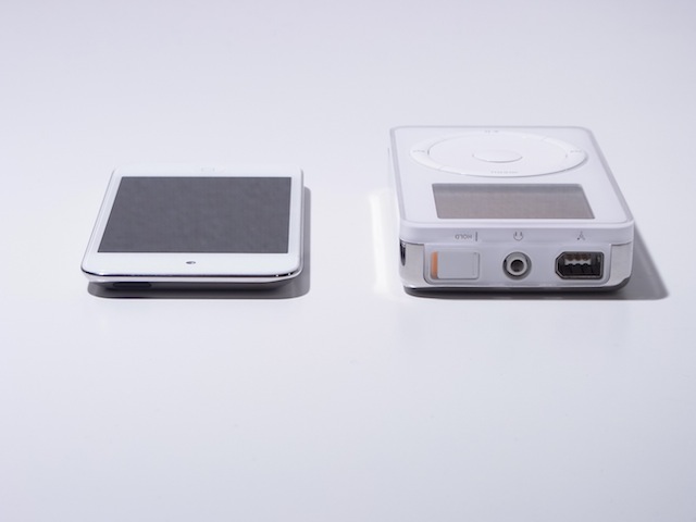 Une jolie photo comparative entre un iPod de 2001 (molette mécanique, disque dur de 5 Go) et un iPod (touch) de 2011 (écran tactile, mémoire flash d’au moins 8 Go). Joli, surtout quand on sait que l’iPod touch vaut environ la moitié du prix de l’iPod de l’époque.