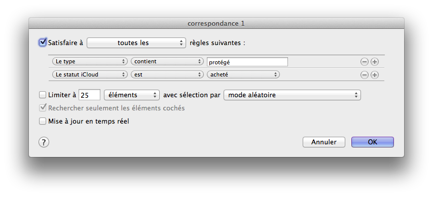Maintenant, on va transformer tous les fichiers du disque dur qui ne sont pas des fichiers achetés en fichiers issus d’iCloud. Le plus simple est de créer une liste de lecture intelligente.