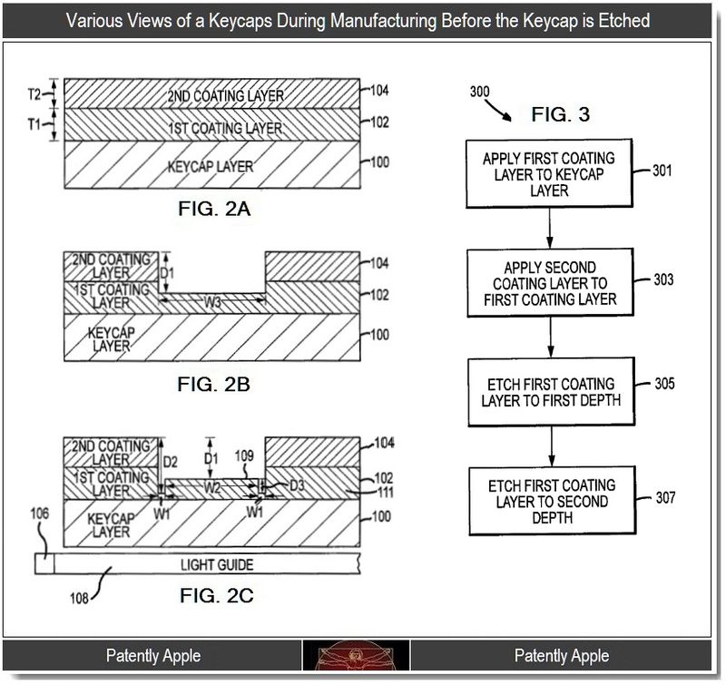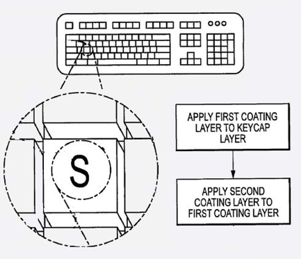 La technique, applicable à un clavier mais aussi au bouton Home d’un iPhone par exemple, consiste à utiliser des touches fabriquées dans un matériau transparent que l’on recouvre d’abord de deux couches de peintures, avec des couleurs différentes. Et il faut ensuite effacer au fur à à mesure les deux couches pour former le caractère. dans le brevet, on voit que le symbole lui-même est de la couleur de la seconde couche, avec un contour sans peintures. dans l’absolu, ça permet de faire des touches avec un contraste correct en temps normal qui mais s’éclairent correctement une fois rétroéclairées. Parce qu’actuellement, et c’est le seul petit problème, les touches des claviers actuels (noirs) sont peu contrastées.