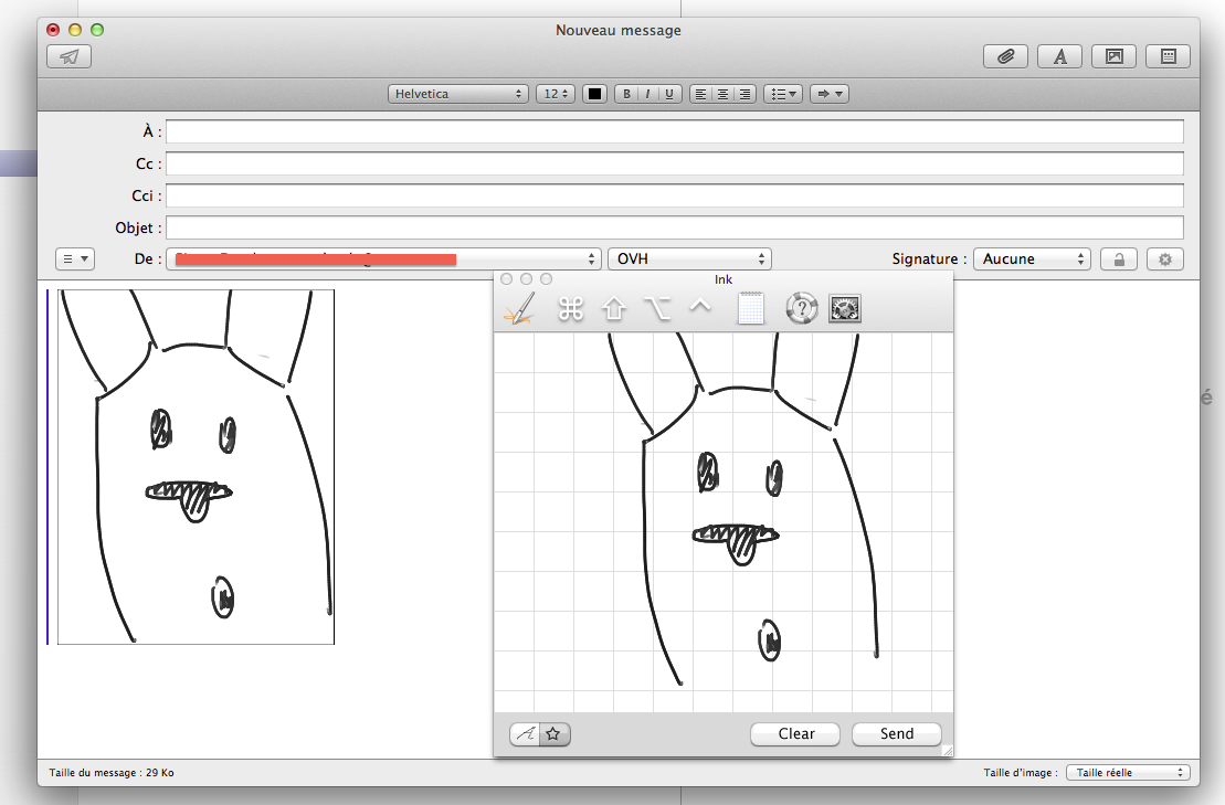 Dans le bloc-notes, il suffit d’écrire et si c’est assez régulier (pas comme moi…) ça devrait transformer vos lettres en texte. Ensuite, un simple appui sur Send envoie le texte dans une application, comme ici Mail.