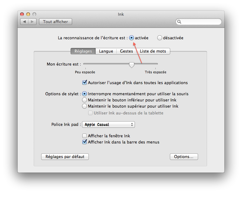 La première chose à faire est d’activer Ink et de régler les quelques options disponibles.