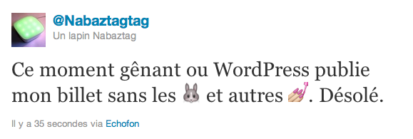 Bon, visiblement WordPress n’apprécie pas que j’essaye de mettre des petits lapins dans mes messages. Pour les amateurs, un exemple de post Twitter avec des emoji. En photo pour ceux qui n’utilisent pas Safari :