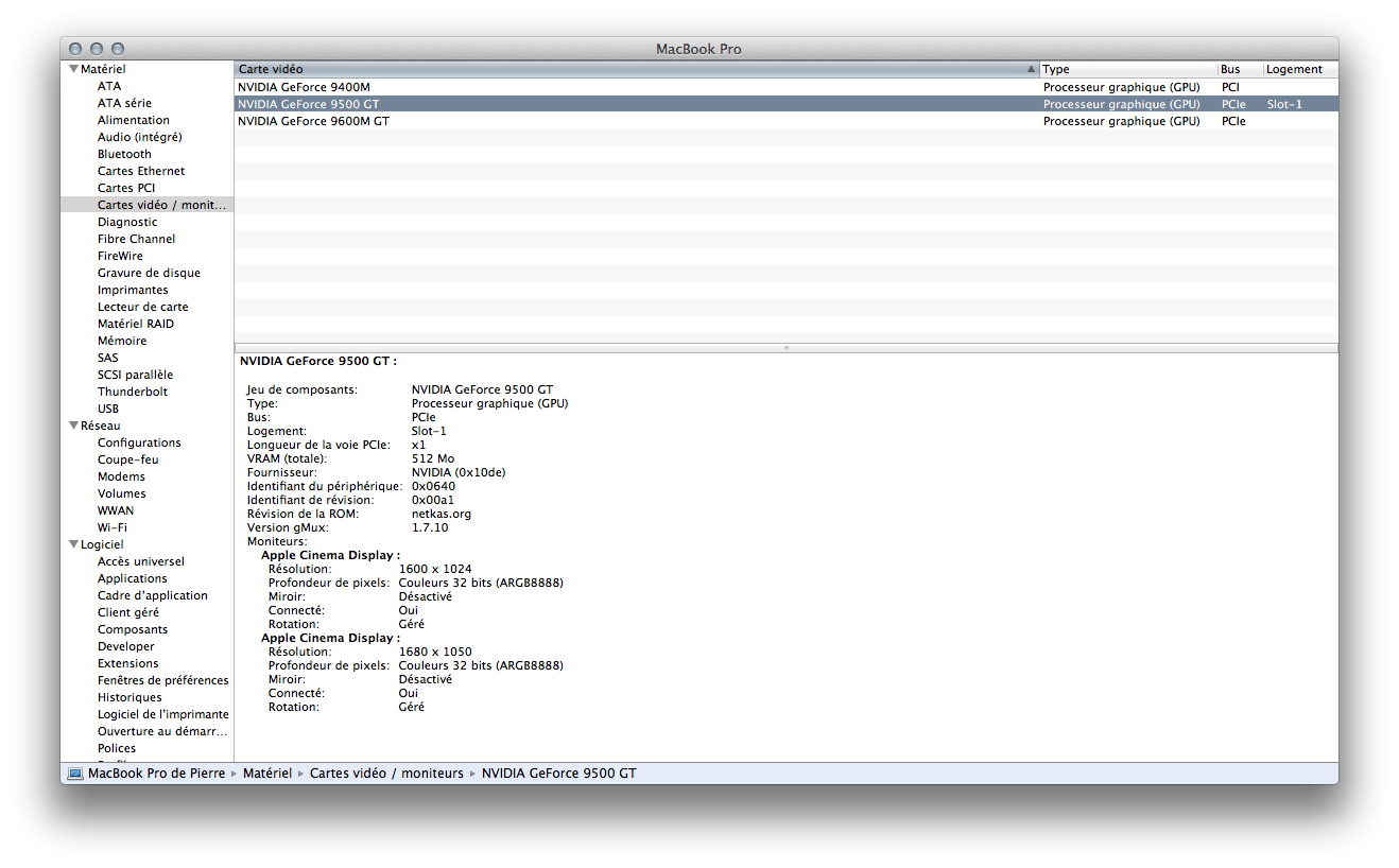 Then you have to play the « hackintosh » for it to work : I had to install ATY_init, a tool that actually inject the « BIOS » of the card in the Mac OS X drivers. No need for other hacks, just install the Kext. The card is also not recognized as a GeForce GT120 but as a GeForce 9500 GT. Good news, both outputs work well.
