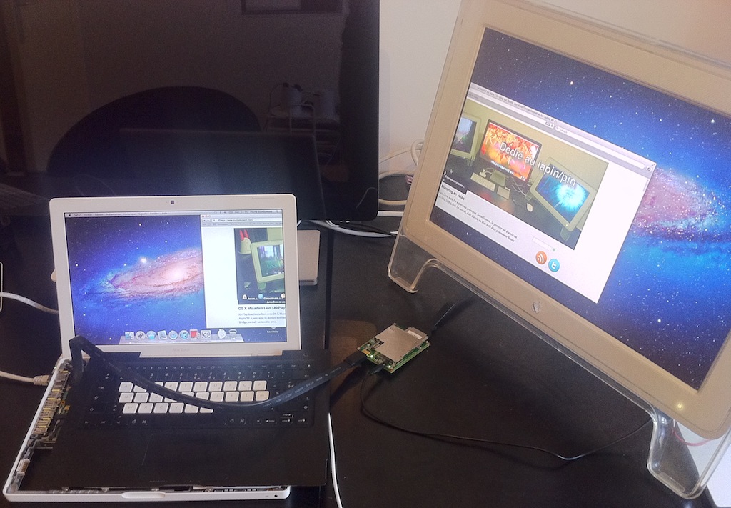 Pour le reste, ça nécessite d’ouvrir le MacBook et on perd le Wi-Fi. Pour ceux qui en auraient vraiment l’utilité, le câble de liaison (plat) est un simple Mini HDMI, donc il est possible de faire un truc propre en découpant une sortie au niveau de la charnière.