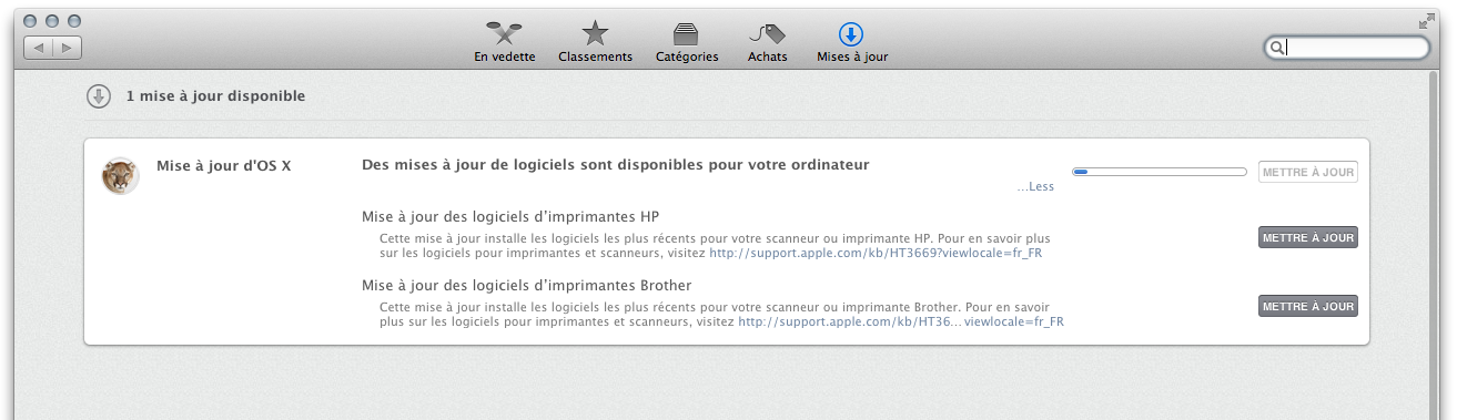 Petite nouveauté dans OS X Mountain Lion : des notifications pour les mises à jour des applications mais surtout l’intégration de la mise à jour du système dans le Mac App Store. Fini les mises à jour dans un logiciel dédié, le Mac App Store va aussi mettre à jour vos pilotes, Mac OS X, l’EFI, iTunes, etc. Une simplification bienvenue.
