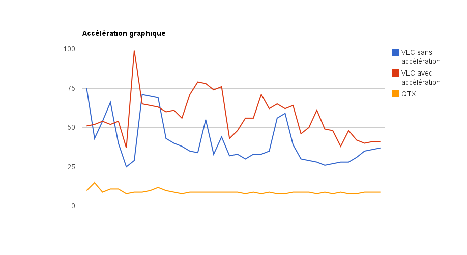 Comme le montre le graphique, ça utilise nettement plus de CPU avec l’accélération, mais surtout le fait de simplement passer à QuickTime X permet de rester sous les 10 % d’occupation du processeur…