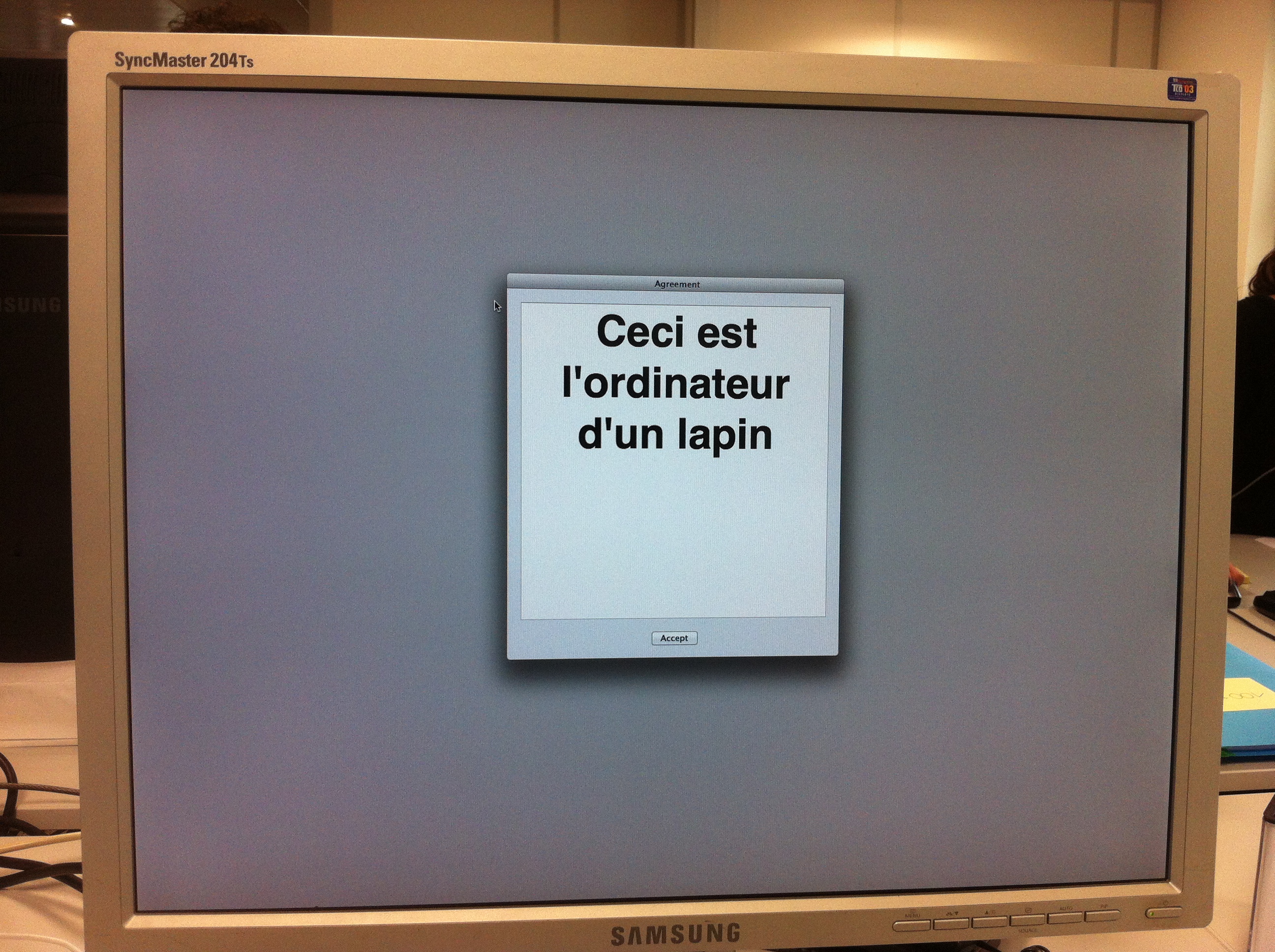 Apple propose avec Lion (et peut-être avant ?) de mettre un message personnalisé au démarrage d’un Mac. C’est assez simple à faire et ça peut servir sur des machines en accès public, par exemple.