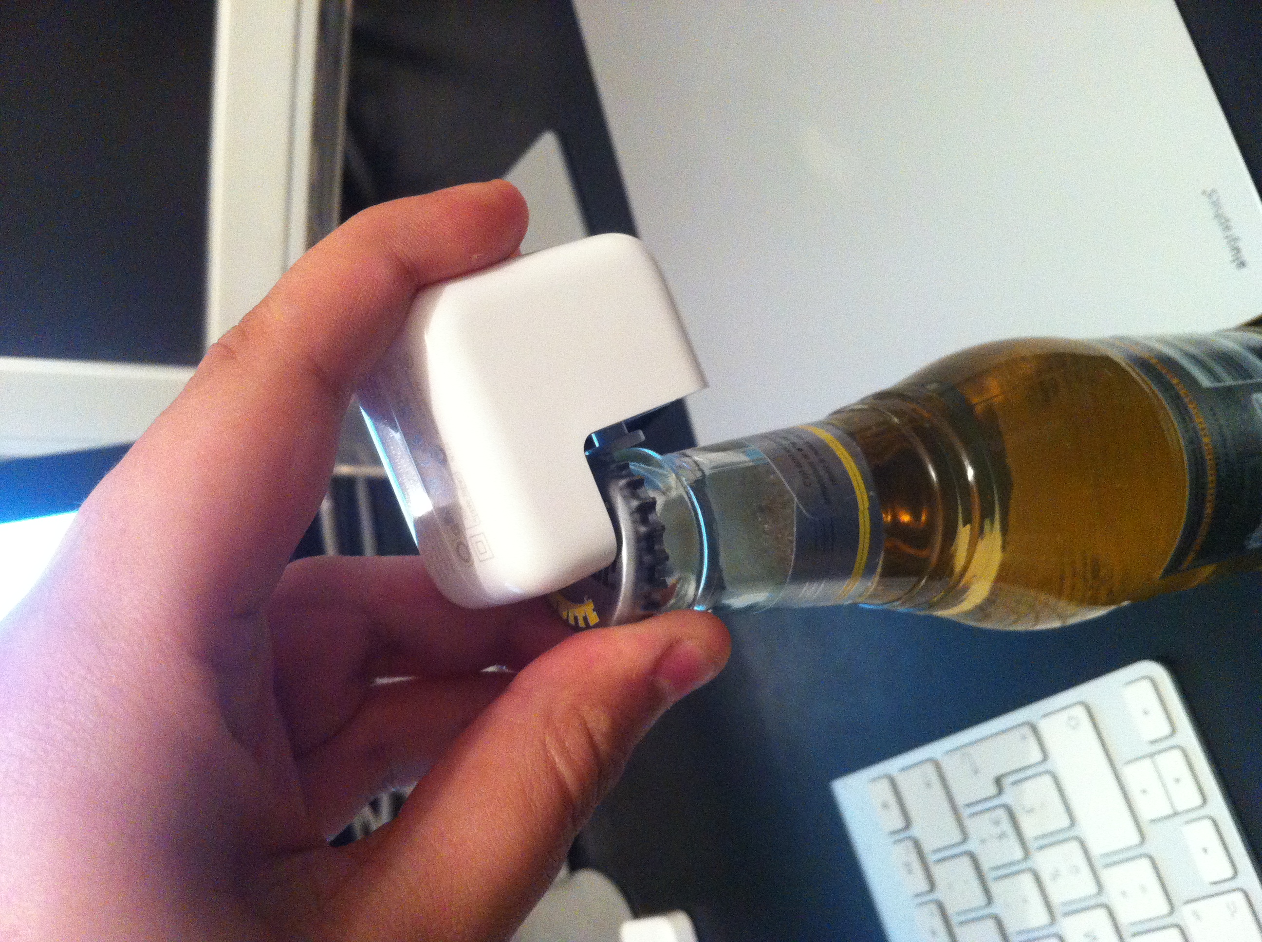 Quand un geek n’a pas de décapsuleur, il a… un chargeur d’iPad. Attention à ne pas prendre un modèle d’iPod ou d’iPhone, la pièce interne est en plastique et pas en métal… (via OSX Daily)