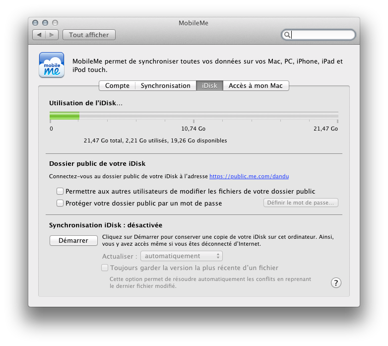 Il faut se rendre dans les Préférences Système, puis dans MobileMe et enfin dans iDisk. Là, il faut simplement activer la synchronisation iDisk et attendre. En fait, Mac OS X va simplement cloner l’iDisk dans une image disque sur votre ordinateur. La synchronisation peut évidemment prendre un certain temps, en fonction de votre connexion et de l’espace utilisé sur votre iDisk.