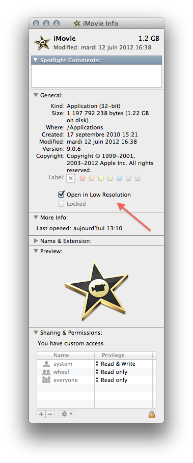 Une fois en HiDPI, l’interface est calculée en 2x et donc l’image et les éléments d’interface sont très fins. Pour voir la différence entre un truc adapté et un qui ne l’est pas, c’est assez simple : il suffit de lancer un programme en HiDPI puis en mode normal. Pour, ça c’est assez simple : clic secondaire sur une application adaptée (comme iMovie), Afficher les informations, et ensuite on coche la case pour l’ouverture en basse définition.