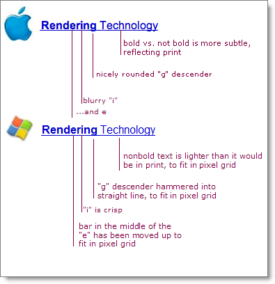 C’est lié au fonctionnement même de ClearType, le moteur de rendu de Microsoft. Il est prévu pour offrir un confort de lecture maximal et pas nécessairement pour rendre fidèlement le texte. Concrètement, ClearType va dans certains cas décaler certains éléments des polices pour coller à la grille de pixels de l’écran et donc fournir des textes plus nets qu’avec le moteur de rendu d’Apple, Quartz, qui est prévu pour rendre le texte le plus fidèlement possible.