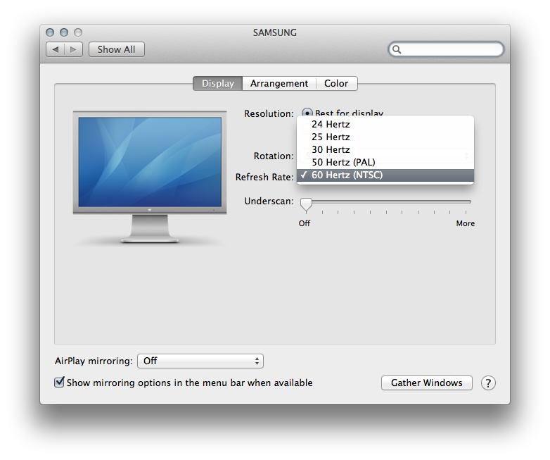 Avec Mountain Lion et Lion (dans certains cas), la gestion des écrans est un peu modifiée. Premier point, les téléviseur sont bien reconnus, avec la gestion de l’overscan en HDMI (ici via un adaptateur DVI vers HDMI) et des différents taux de rafraîchissements, ce qui n’était pas le cas sous Lion sur des machines qui n’avaient pas du HDMI en standard.