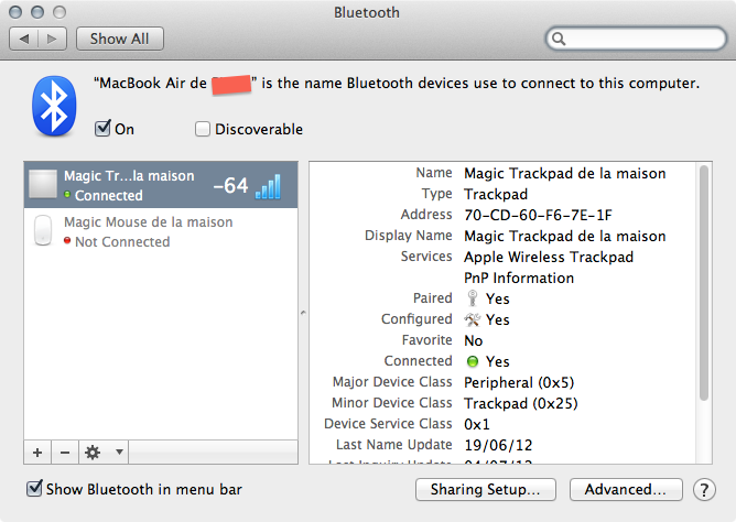 Petite astuce qui marche sous Lion et Mountain Lion et qui permet d’afficher la qualité du signal Bluetooth : presser option (alt) dans les Préférences Système (section Bluetooth) affiche la puissance du signal. Plus la valeur s’approche de 0, mieux c’est, donc -56 est mieux que -80 par exemple.