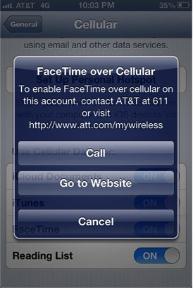 Aux USA, la bêta 3 d’iOS 6 apporte une nouveauté : un message quand on essaye d’utiliser FaceTime en 3G. Et comme pour le partage de connexion, il va donc falloir payer l’opérateur pour activer FaceTime en 3G, il n’y a pas de petits profits…
