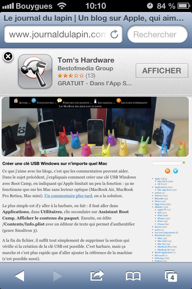 Par contre, petit défaut (tout du moins en bêta 3), l’iPhone 3GS n’affiche pas les Smart App Banner. Je ne sais pas si c’est lié à la bêta ou si c’est définitif.