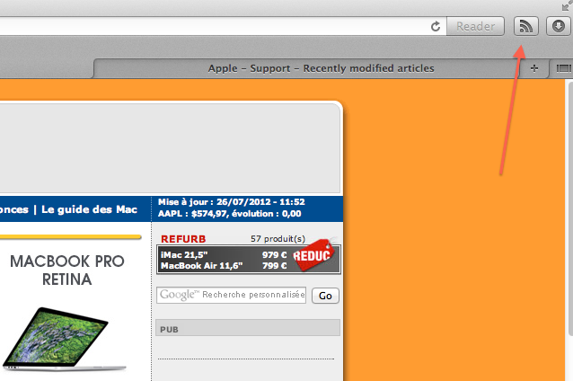 Avec Safari 6, Apple a supprimé totalement le support du RSS. Si perdre la lecture des flux dans Safari ou Mail n’est pas un souci, l’absence du bouton RSS dans la barre d’adresse en est un. En effet, il était pratique pour envoyer le flux dans un agrégateur. Avec Safari, les deux solutions sont soit espérer que le concepteur du site a placé un bouton RSS soit aller vérifier dans le code source s’il y a un lien.