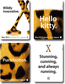 Lors de la sortie de Mac OS X 10.2, Apple a pour la première fois utilisé le nom de code de l’OS, Jaguar (pour Mac OS X 10.1, Puma était déjà utilisé par Ford pour une voiture…) et quelques stickers publicitaires avec des slogans étonnants sont sortis : on associe rarement Hello Kitty à Mac OS X…