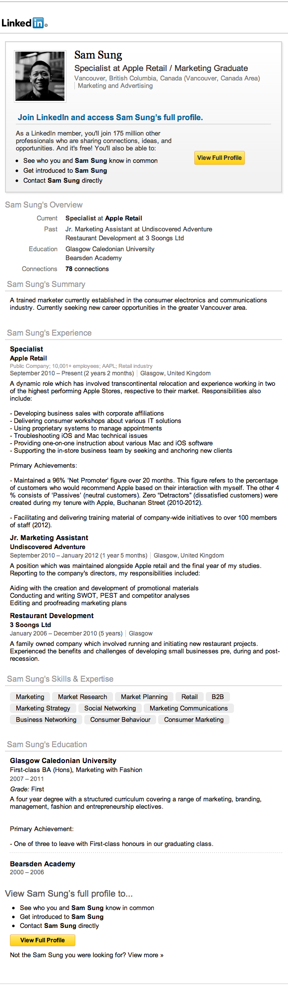 Et une copie de sa page LinkedIn, supprimée hier mais toujours dans le cache de Google.