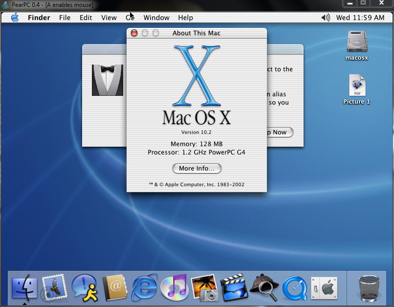 Émuler un Mac sur un PC. En 2012, ça ne sert pas à grand chose : Mac OS X 10.4 à 10.8 tournent assez facilement sur des PC, nativement, sans trop de soucis. Mais en 2005, quand PearPC est sorti, c’était une première : Mac OS X sur autre chose qu’un Mac, assez facilement. Pour le jeu, j’ai décidé — en 2012 — de tenter ce que je n’avais pas fait en 2005, en émulant Mac OS X Jaguar sur un PC classique.