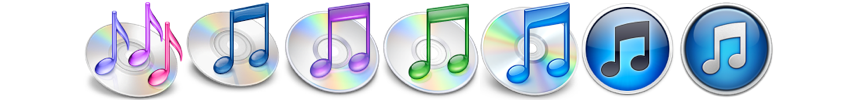 Dans l’ordre : Music App (Mac OS X bêta), iTunes 1.x, iTunes 2.x, iTunes 3.x, iTunes 4/5/6, iTunes 7/8/9, iTunes 10.