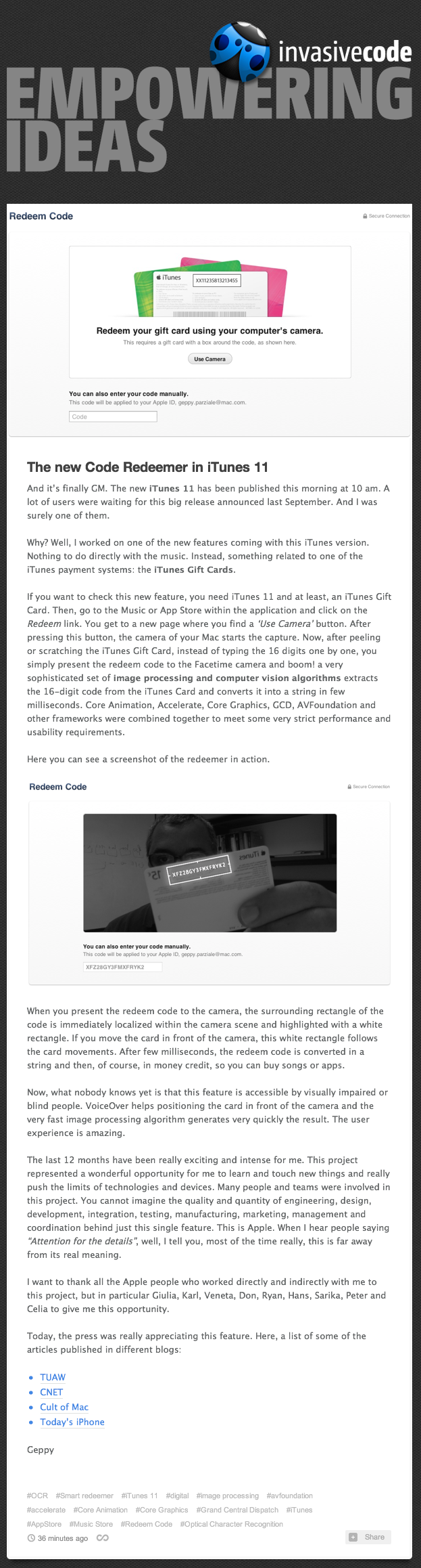 Selon un billet de blog qui n’est plus en ligne (une capture dans la suite), la fonction a été pensée pour les personnes malvoyantes et utilise notamment VoiceOver et les fonctions d’accessibilité de Mac OS X. Visiblement, le travail a été très long pour une fonction qui peut sembler mineure, mais le résultat est plutôt efficace.