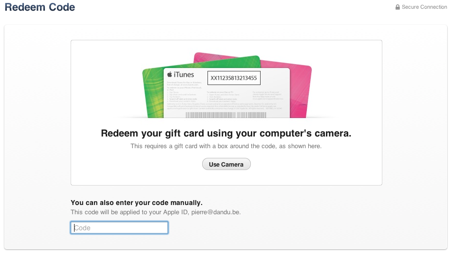 Le fonctionnement est simple : un bouton Use camera est présent dans iTunes et il suffit de passer la carte devant la webcam : iTunes va lire la carte et récupérer directement le code.