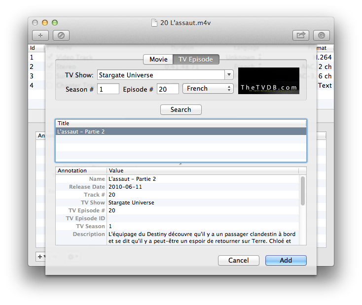 Petite fonction que je n’avais jamais remarqué dans le très bon Subler : la récupération des jaquettes et des informations sur les séries.