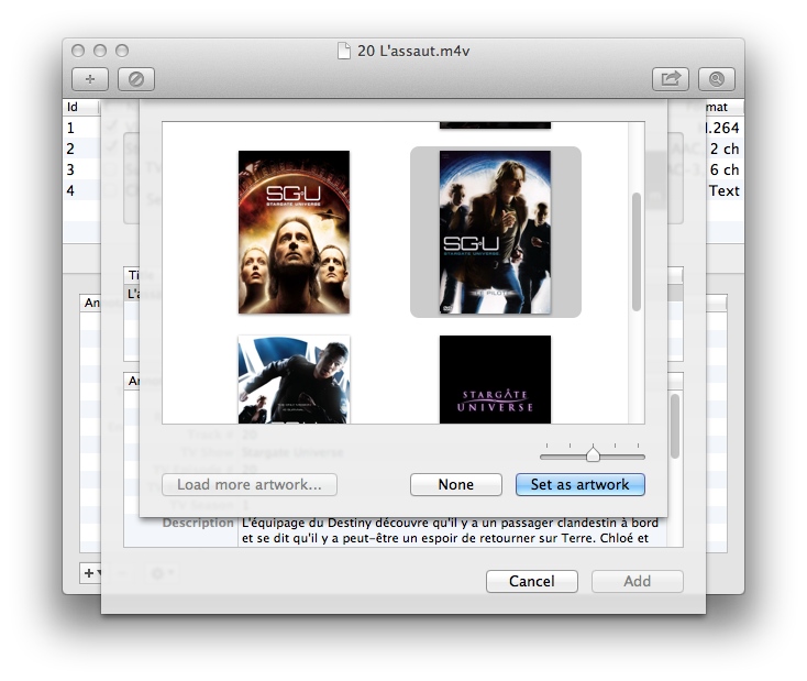 Vous venez — comme moi — d’encoder la série Stargate Universe depuis des DVD pour la regarder sur l’Apple TV, et vous voulez une jolie image de couverture ? C’est assez simple avec Subler.