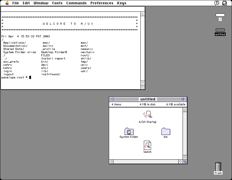 A/UX a été développé de 1988 à 1995, le passage aux PowerPC chez Apple a signé l’arrêt de mort du système d’exploitation qui a terminé sa vie en version 3.1.1.