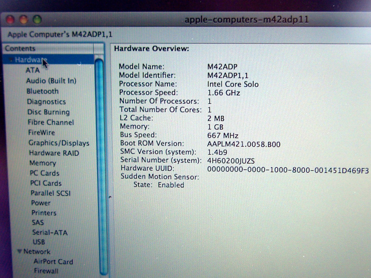 The M42ADP1,1 also has a particularity: it uses a Core Solo processor, whereas the MacBook always had a Core Duo — the Mac mini is the only model that was equipped with a Core Solo. The change was probably made towards the end of development; for example, the MacBook Pro went from 1.67/1.83 GHz at its announcement to 1.83/2 GHz at launch.