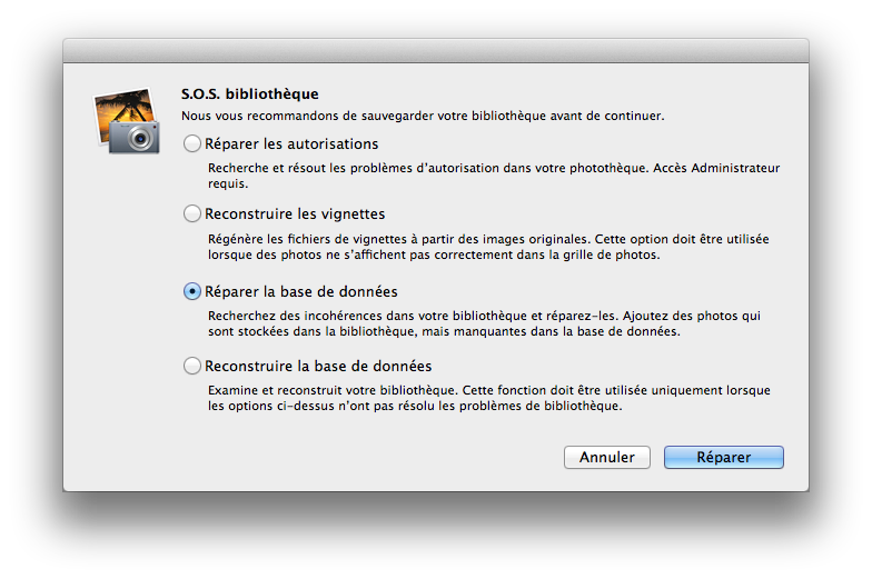 Maintenant, on lance iPhoto en pressant option et command. Un menu devrait apparaître avec la possibilité de réparer la base de données. Ca peut prendre (beaucoup) de temps et éventuellement trouver des soucis. Si des photos sont récupérées (mon cas), il vaut mieux vérifier si ce sont des doublons (ou pas) et ensuite les supprimer.