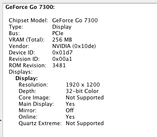 Au niveau du GPU, Tiger indique 256 Mo de RAM pour la carte GeForce 7300 Go connectée en PCI-Express (2x) mais c’est à cause du pilote de base qui utilise les fonctions TurboCache du GPU. En réalité, la carte dispose de 64 Mo de mémoire dédiée.