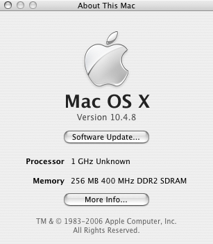 Là, on fait un truc simple : on installe Mac OS X Tiger sur le disque dur externe, depuis une machine compatible. Une fois installé, on le configure de façon classique, avec un utilisateur, etc. S’il n’est pas déjà en 10.4.8, il faut effectuer la mise à jour.