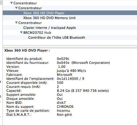 Pour les lire, c’est donc assez simple. Il faut d’abord un lecteur de HD DVD, peut-être le plus compliqué à trouver. Le modèle vendu par Microsoft pour la Xbox 360 fonctionne très bien sur Mac et se connecte en USB. On le trouve sans trop de soucis sur eBay ou leboncoin, même si le prix est parfois un rien exagéré. Il suffit de la brancher pour qu’il fonctionne, et seule la carte mémoire intégrée de 256 Mo n’est pas fonctionnelle.