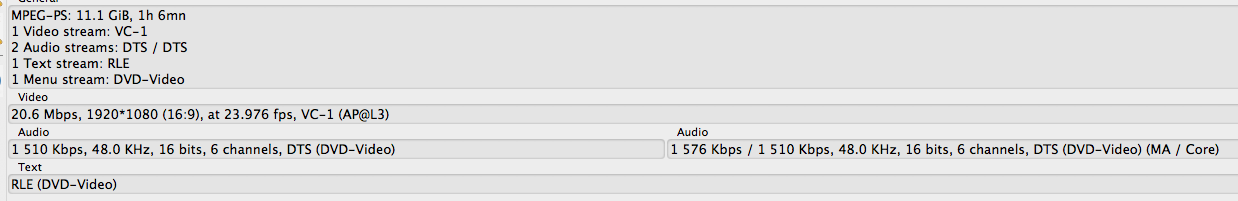 Sur mes deux essais (Chronos et Stalingrad), le premier propose du MPEG2 pour la vidéo et quatre pistes audio (DTS, E-AC3 et PCM), le second du VC1 et 2 pistes audio (DTS).