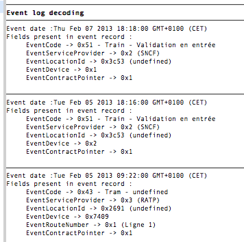 La semaine dernière, j’expliquais comment charger une carte Navigo en USB sur un Mac. C’est une application RATP, ils vendent le lecteur pas trop cher (7 €) et ça marche assez bien. Mais si on allait voir ce qu’il y a exactement dans la carte ?