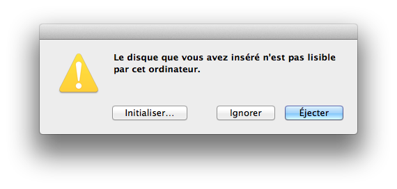 Ensuite, on lance le Terminal. Attention, on va supprimer les partitions, donc penser à débrancher les autres disques durs, ça évite de faire des bêtises. Il faut aussi éjecter les différentes partitions éventuelles du nouveau disque dur.