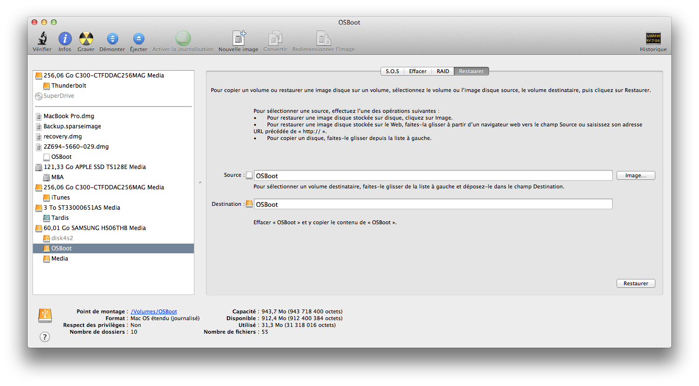Maintenant, il suffit de restaurer l’OS téléchargé sur la partition dédiée. Il faut donc monter l’OS téléchargé (sous le nom OSBoot), cliquer sur la partition OSBoot physique dans l’utilitaire de disque et restaurer le premier sur le second. Ca va normalement assez vite, en fonction de votre disque dur.
