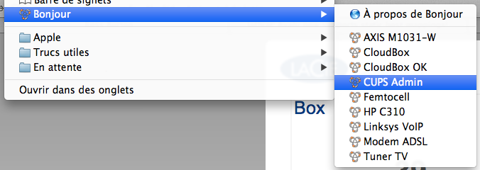 L’idée est simple : Safari intègre Bonjour dans ses signets et peut afficher la liste des appareils qui s’annoncent via Bonjour. Chez moi, j’ai l’imprimante, la caméra, le tuner TV réseau et un NAS (qui au passage annonce un erreur 404, merci LaCie). Mais d’autres appareils ne s’annoncent pas, comme par exemple le boîtier VoIP, et c’est souvent la galère d’essayer de se souvenir de son adresse IP et éventuellement du port de connexion. On va donc utiliser le Raspberry Pi comme relais pour les appareils qui ne sont pas compatibles avec Bonjour.