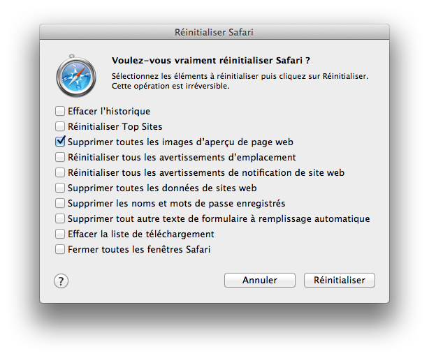 Mais Wacom et ma Pomme (excellent site) propose une petite solution pour désactiver ce système. Pour vider le dossier, soit vous le faites à la main, soit vous passez par Safari -> Réinitialiser Safari… -> Supprimer toutes les images d’aperçu de pages web.