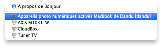 Ensuite, l’appareil photo est accessible depuis Safari via Bonjour : Signets -> Bonjour.