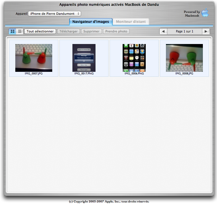 On a un navigateur d’images qui permet de voir les images partagées, les télécharger, etc. Dans certains cas, on peut même prendre des photos à distance… On peut même sélectionner un appareil si on en a connecté plusieurs.