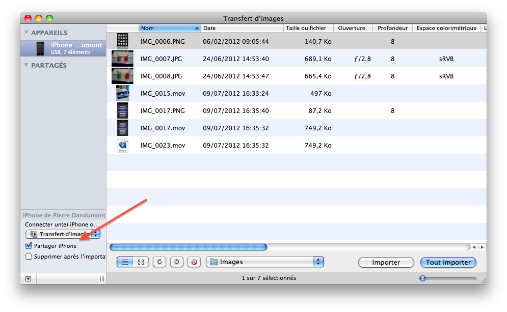 Il faut lancer Transfert d’images puis aller dans Appareils -> Parcourir le contenu des appareils… -> Partager…. Il faut ensuite cocher Partager mes appareils et Activer le partage via le Web.