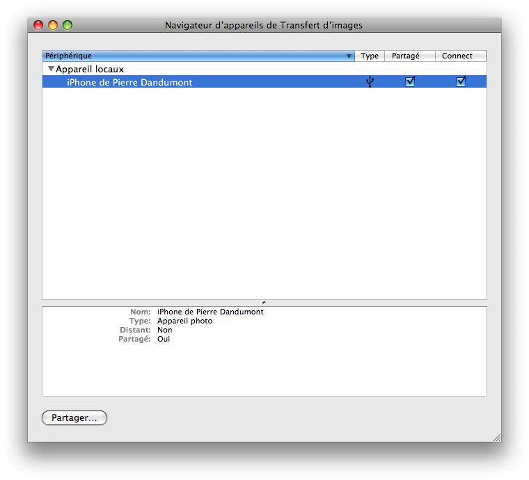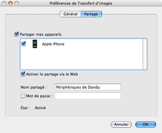 Sous Snow Leopard, la page n’est pas partagée, Transfert d’images partage uniquement en ICA. Comme je n’ai qu’une machine sous Snow Leopard, impossible de vérifier que ça fonctionne correctement : le service est bien annoncé via Bonjour, donc un autre ordinateur devrait y avoir accès.