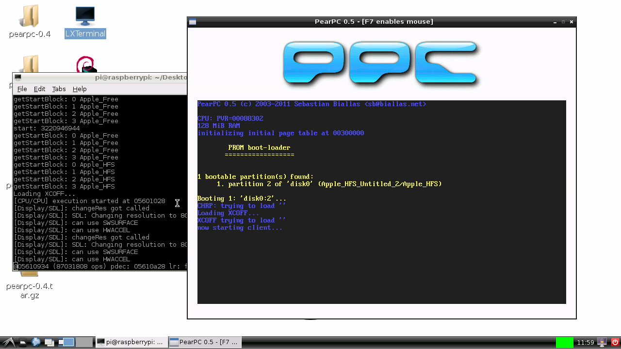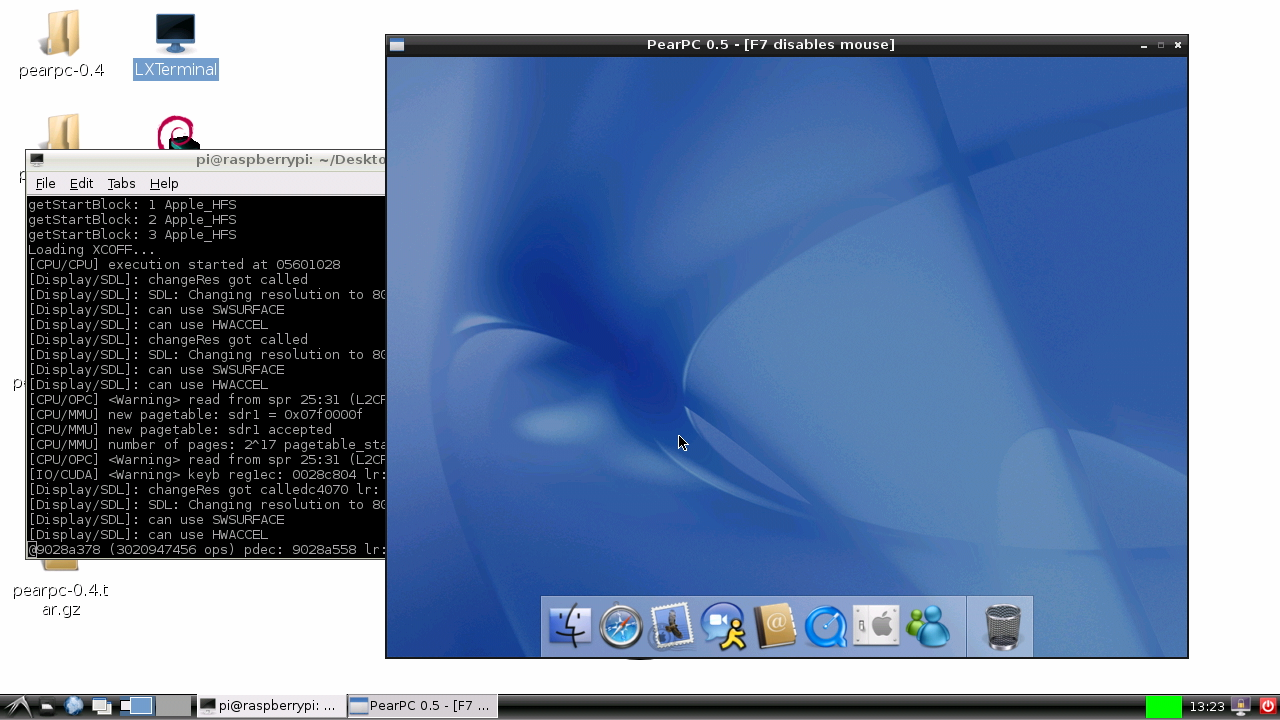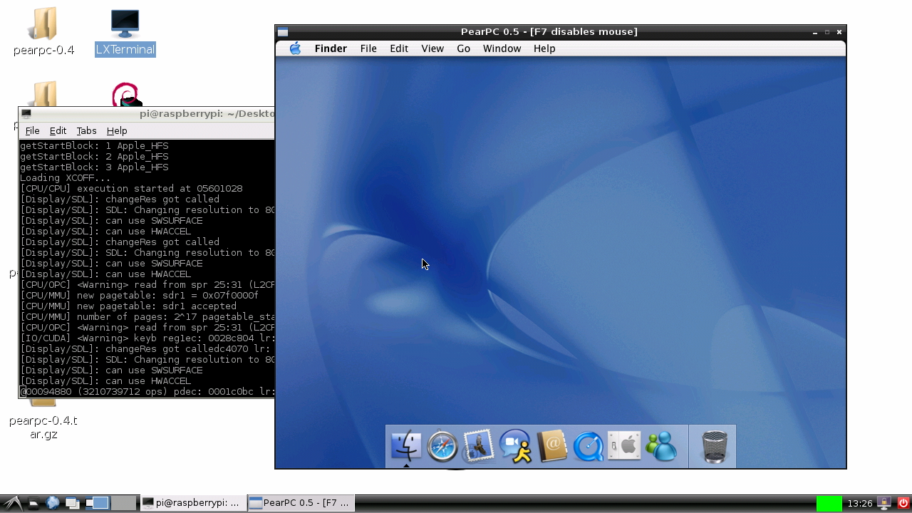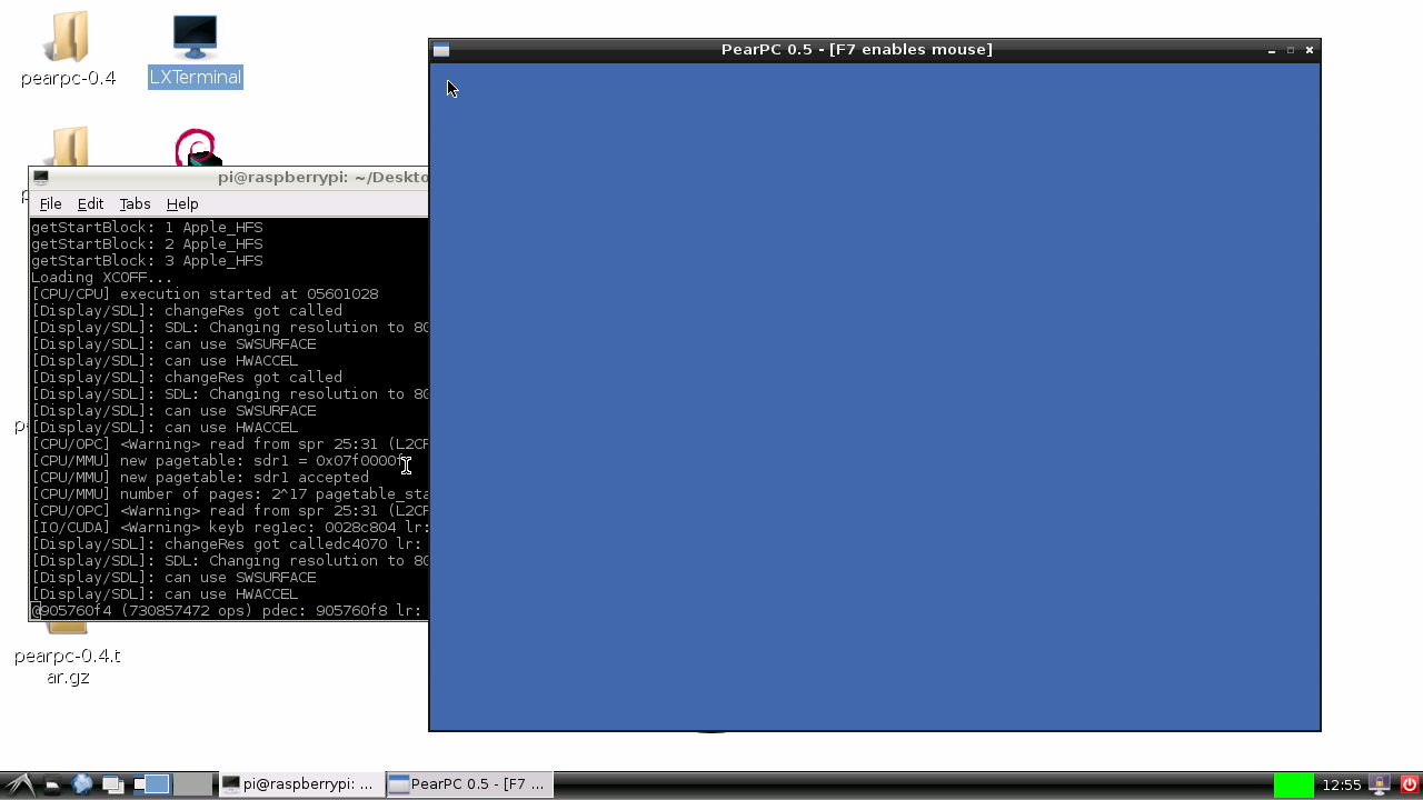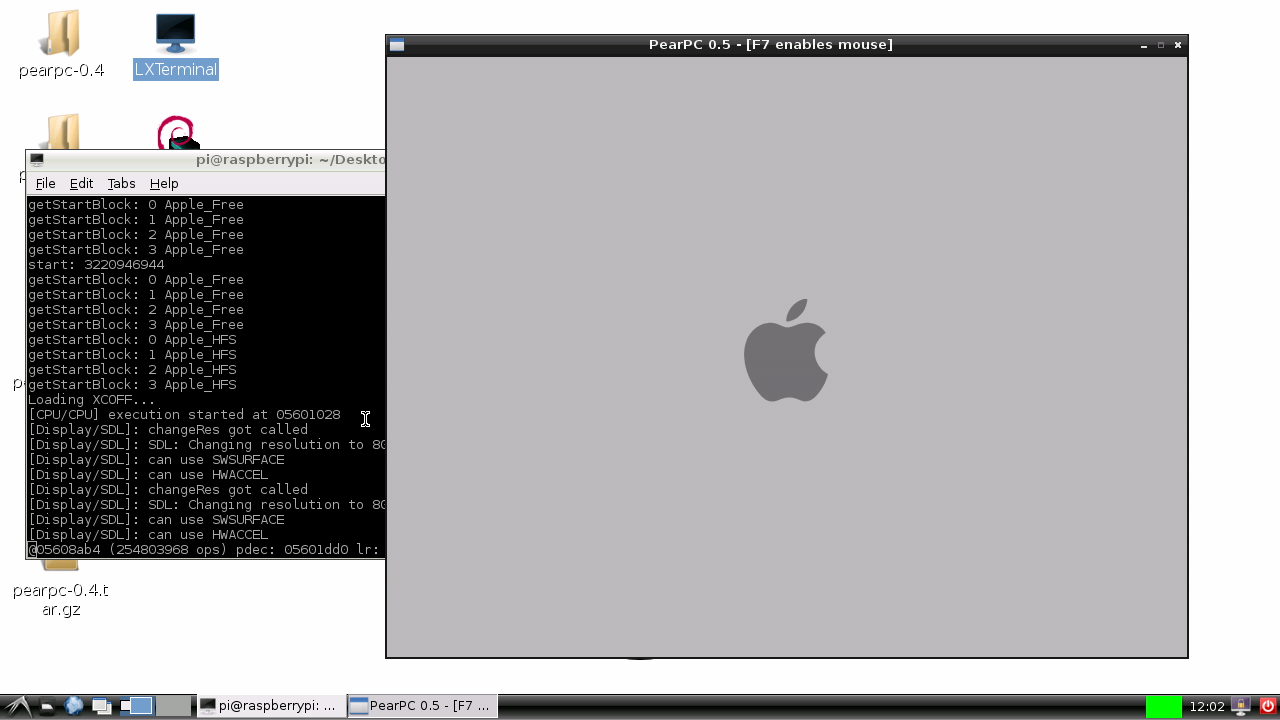 Je vous passe les détails, mais il y a un truc à noter : PearPC n’a pas voulu se compiler sur Raspbian, la distribution Linux dédiée au Raspberry Pi et à son processeur. Sur une Debian plus classique, par contre, ça marche, mais ça pose un souci : ce n’est pas du tout optimisé pour le processeur, on se retrouve avec du code ARMv5 et pas de FPU (le Raspberry Pi a un ARM11 compatible ARMv6 avec FPU).