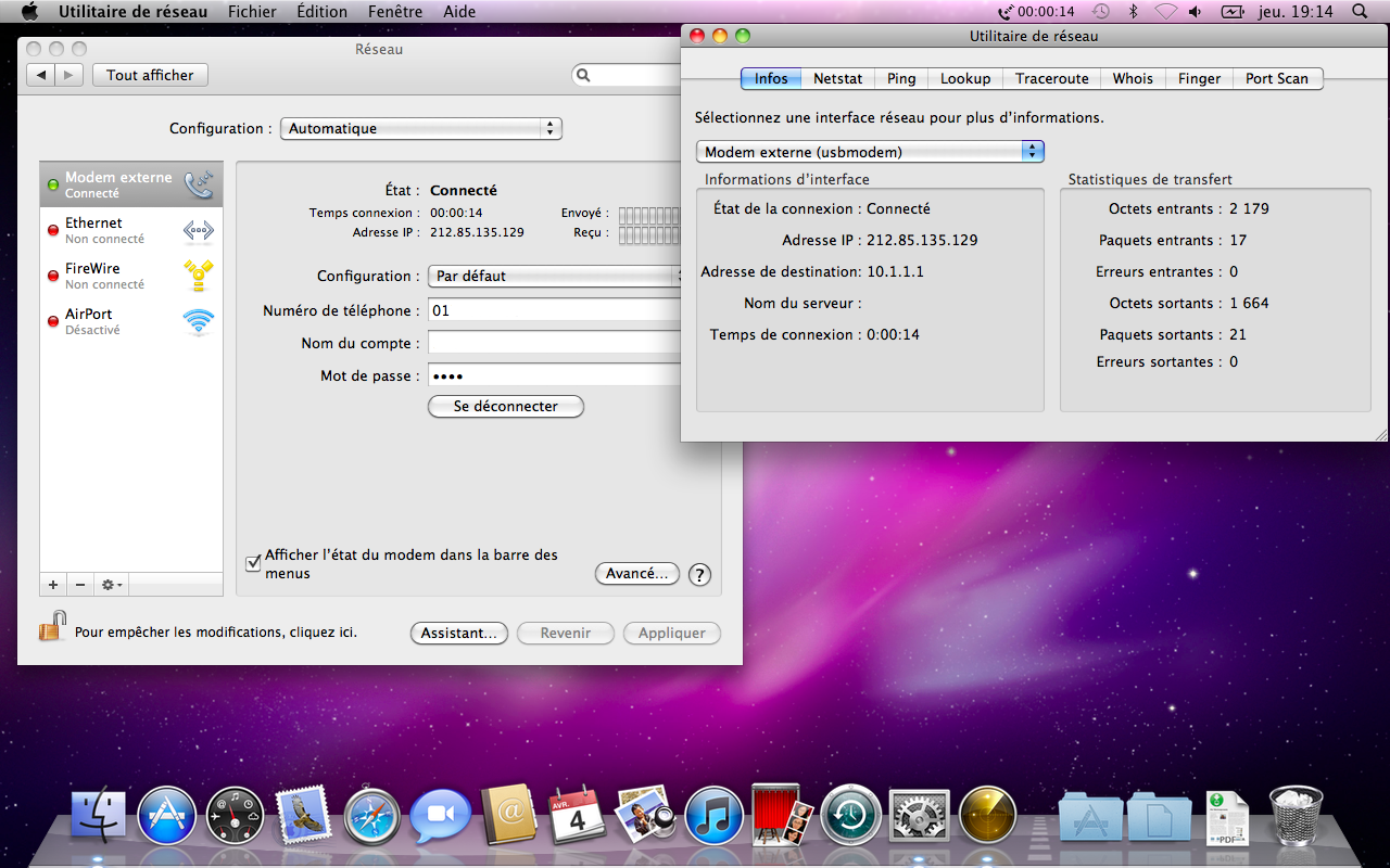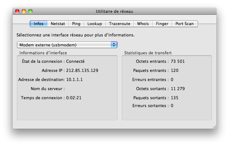 Dans mon cas, j’ai utilisé un modem V.92 classique (un modem Apple USB), une ligne VoIP OVH (avec du QoS au niveau du modem) et un FAI qui offre une connexion via un numéro local. Les numéros en 08 utilisés généralement pour les connexions RTC ne semblent en effet pas passer chez OVH, ce qui est finalement assez logique.