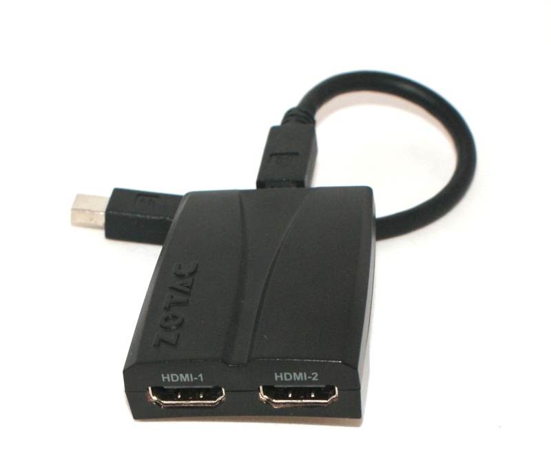 Zotac propose un adaptateur, le MDP2HDMI, un petit boîtier qui vaut environ 50 $, alors que les solutions Matrox sont vendues au minimum quatre fois ce prix. Attention, une version DisplayPort existe, mais elle n’est évidemment pas adaptée aux Mac, qui utilisent majoritairement du Mini DisplayPort.