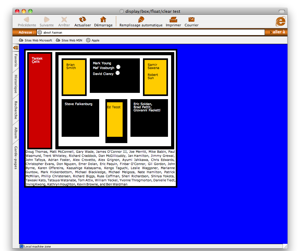 Petit Easter Egg du navigateur, qui était d’ailleurs assez respectueux des standards — il utilisait un moteur de rendu différent de la version Windows —, avec le premier AcidTest (modifié) quand on tape about:tasman dans la barre d’adresse.