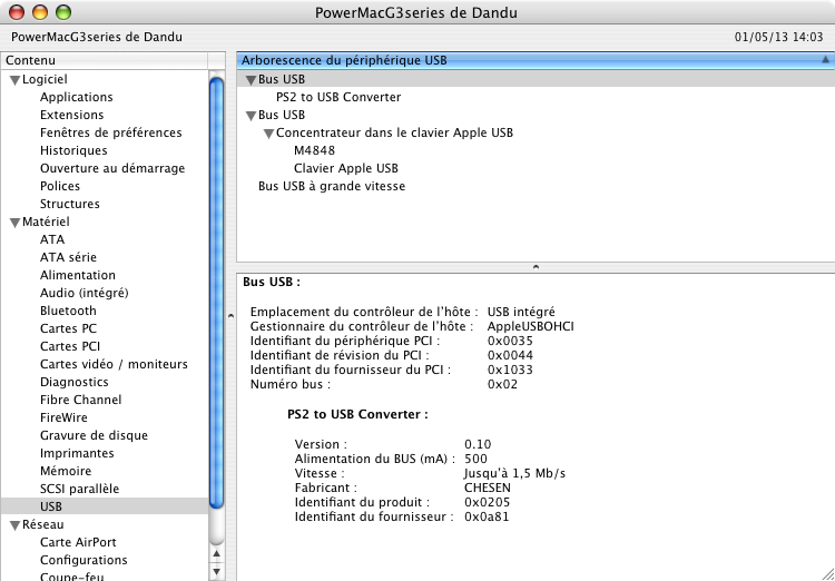 Typiquement, la carte que j’ai acheté pour une bouchée de pain sur eBay intègre un contrôleur USB 2.0 NEC (bonne nouvelle), deux ports USB 2.0 parfaitement fonctionnels sous Mac OS X et un bridge USB vers PS/2 de chez Chesen, le modèle le plus courant. Il m’a suffit de brancher un clavier PS/2 et une souris PS/2 pour qu’ils fonctionnent directement.