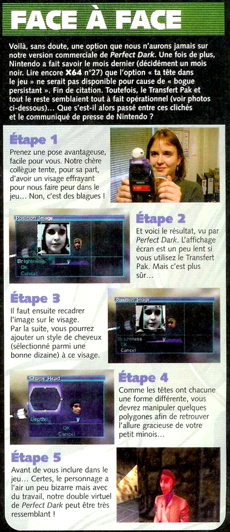 Enfin, le jeu perfect Dark sur Nintendo 64 (encore) permettait — dans ses versions bêta — d’utiliser un Game Boy Camera et le Transfer Pak pour mettre une tête sur les avatars des joueurs. Officiellement, la fonction a été supprimée pour des raisons techniques. Officieusement, parce que ça marchait bien, c’est pour éviter que des joueurs mettent la tête de leurs amis, leurs profs ou des célébrités…